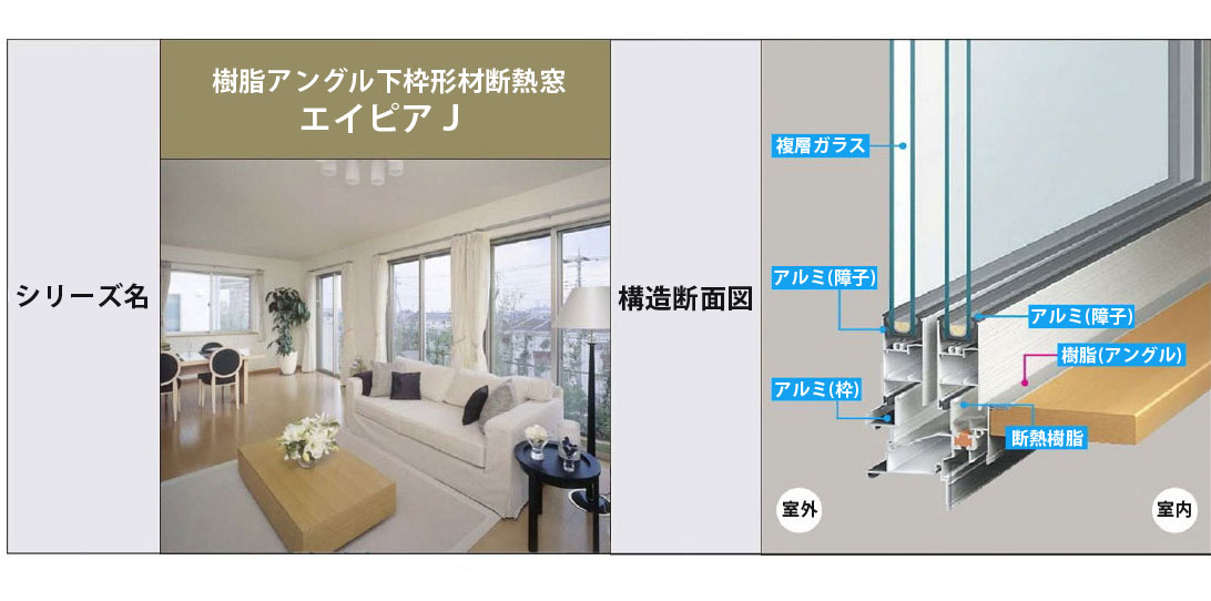 アングルに樹脂を使用し下枠に断熱した、YKKapのサッシ、エイピアJ シリーズ。