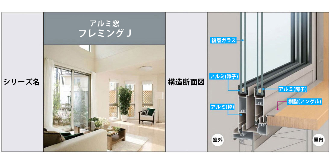 アングルに樹脂を使用した、YKKapの一般普及サッシ、フレミングJ シリーズ。